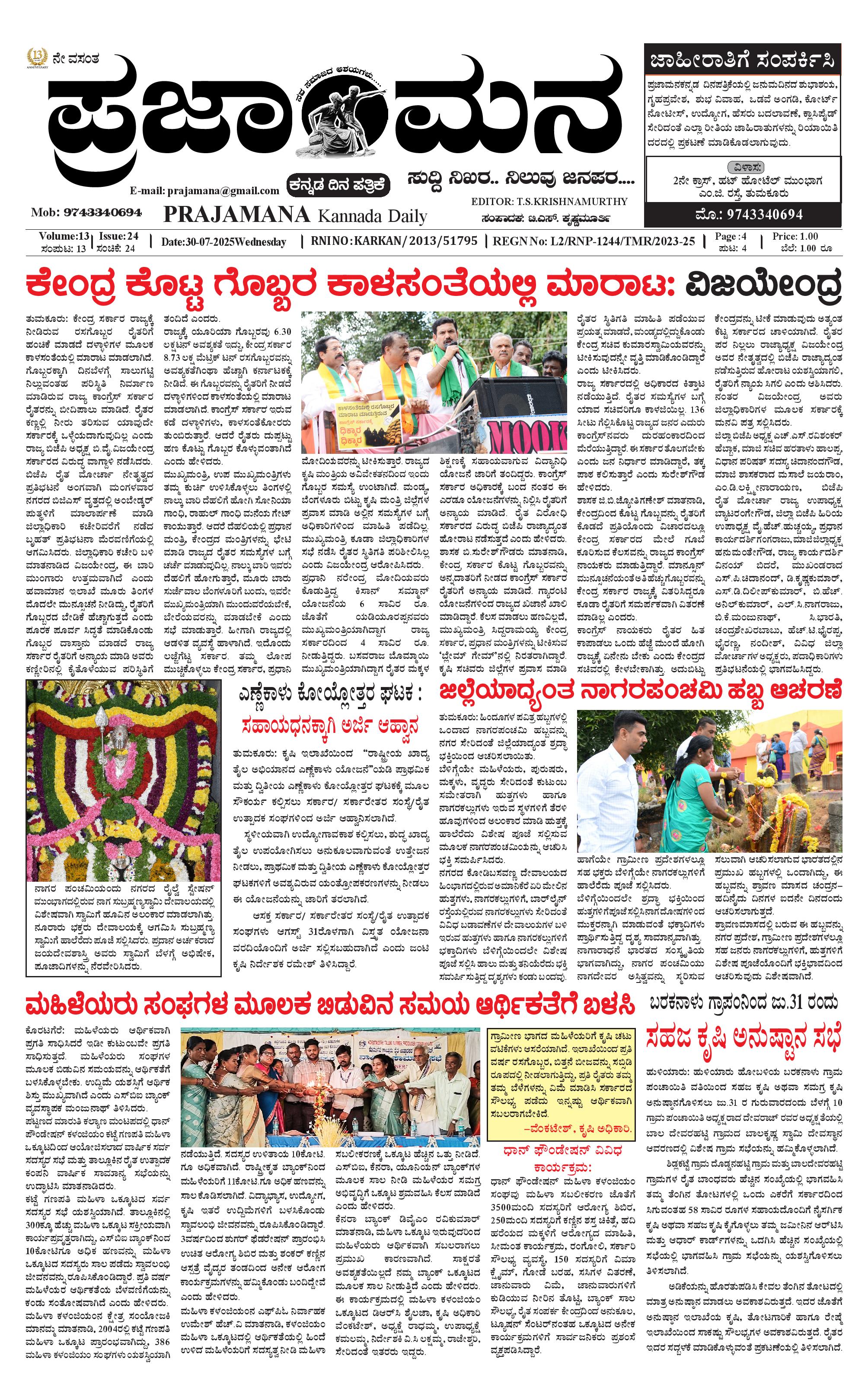 ಪ್ರಜಾಮನ 30 JULY 2025 July 30, 2025 << First << 1 >> Last >> Page 1Page 2Page 3Page 4 × ಪ್ರಜಾಮನ 30 JULY 2025 PRAJAMANA-page-001PRAJAMANA-page-002PRAJAMANA-page-003PRAJAMANA-page-004 << First << 1 >> Last >> PRAJAMANA-page-001PRAJAMANA-page-002PRAJAMANA-page-003PRAJAMANA-page-004 PRAJAMANA-page-001