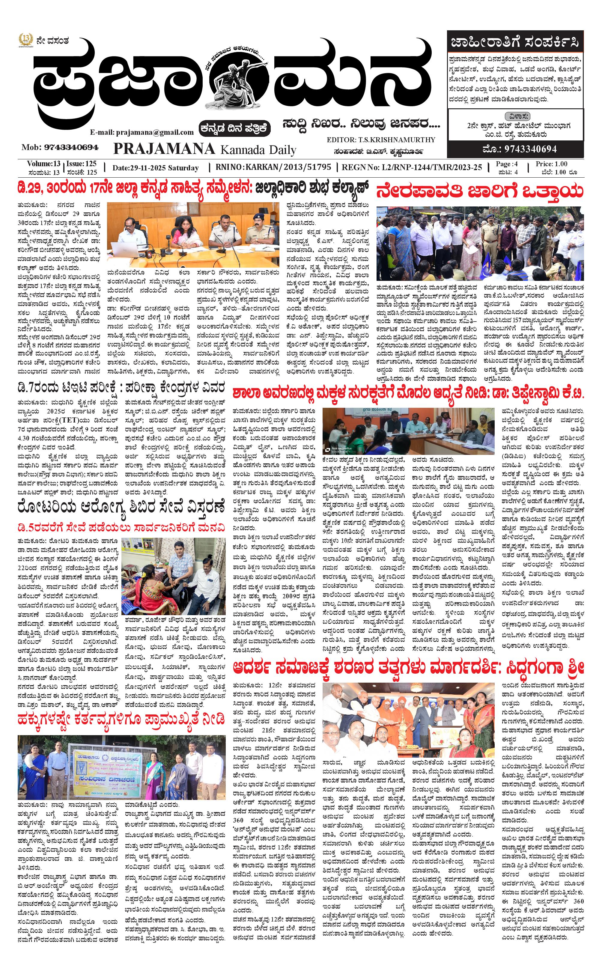 ಪ್ರಜಾಮನ 29 NOVEMBER 2025 November 29, 2025 << First << 1 >> Last >> Page 1Page 2Page 3Page 4 × ಪ್ರಜಾಮನ 29 NOVEMBER 2025 PRAJAMANA-page-001-1PRAJAMANA-page-002PRAJAMANA-page-003PRAJAMANA-page-004-1 << First << 1 >> Last >> PRAJAMANA-page-001-1PRAJAMANA-page-002PRAJAMANA-page-003PRAJAMANA-page-004-1 PRAJAMANA-page-001-1