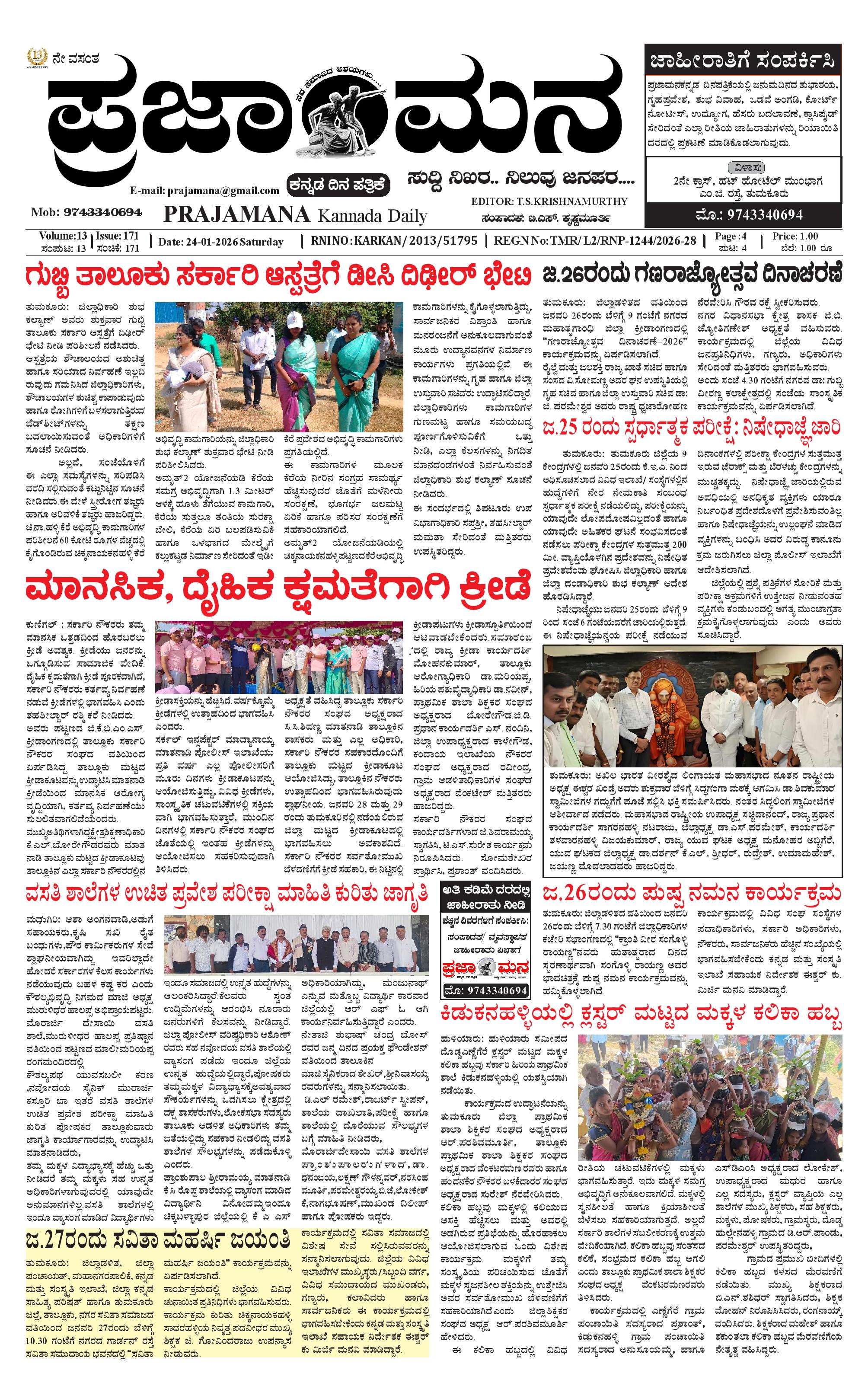 ಪ್ರಜಾಮನ 24 JANUARY 2026 January 24, 2026 << First << 1 >> Last >> Page 1Page 2Page 3Page 4 × ಪ್ರಜಾಮನ 24 JANUARY 2026 PRAJAMANA-page-001PRAJAMANA-page-002PRAJAMANA-page-003PRAJAMANA-page-004 << First << 1 >> Last >> PRAJAMANA-page-001PRAJAMANA-page-002PRAJAMANA-page-003PRAJAMANA-page-004 PRAJAMANA-page-001