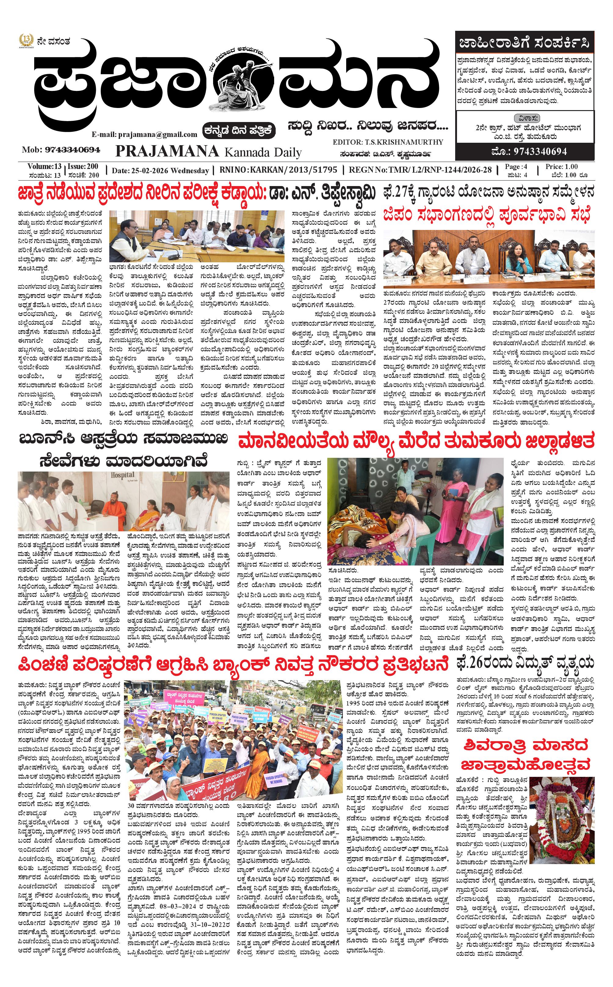 ಪ್ರಜಾಮನ 25 FEBRUARY 2026 February 25, 2026 << First << 1 >> Last >> Page 1Page 2Page 3Page 4 × ಪ್ರಜಾಮನ 25 FEBRUARY 2026 PRAJAMANA-page-001PRAJAMANA-page-002PRAJAMANA-page-003PRAJAMANA-page-004 << First << 1 >> Last >> PRAJAMANA-page-001PRAJAMANA-page-002PRAJAMANA-page-003PRAJAMANA-page-004 PRAJAMANA-page-001